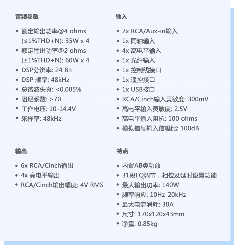 提升主機功率的同時(shí)可營(yíng)造聲場(chǎng)定位,明顯提升音質(zhì)效果,最大限度散發(fā)出音樂(lè )的魅力,將車(chē)內空間應有的音響頻段發(fā)揮到淋漓盡致傳遞最真實(shí)的聲音。